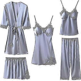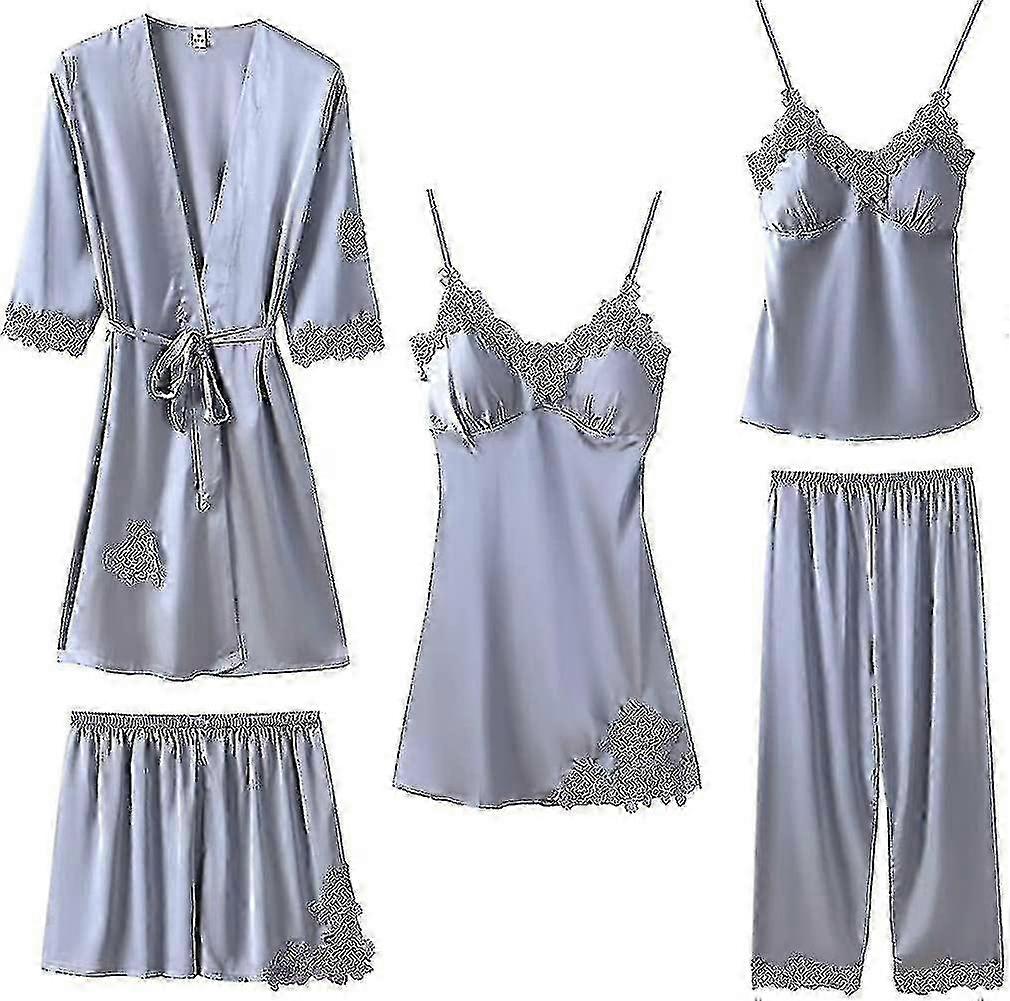Women's 5 Piece Silk Satin Pajama Set - Cami Shorts Nightgown and Robe