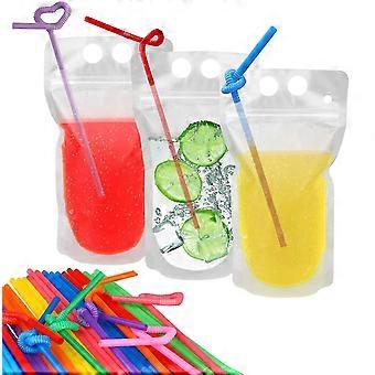 [Perfect for Party] This kind of plastic pouches bags are more novel for caterer and party planner which will make something different for your party and family gathering. They will be the best choice to instead of dangerous usual glassware for the kids.[Airtight and Muti-purpose] Milk, juice, tea, coffee, beans, nuts, candies, energy drinks, healthy smoothies, protein shakes, and cocktails; anything you can imagine and more can be easily stored in our plastic drink containers.[Food-grade Drink Bags] 100 pcs pouches drink bags with 100 pcs straws are food-grade which made of non-toxic, BPA free materials. Round corners for safety, The reclosable zip ensures easy opening and no leaking accidents.[Flat Bottom to Stand] Capacity : 400-450 ml; Bag size: 9*5 inch; Bottom gusset height: 2.4 inch. Fill the drink into the big swallow of these translucent drink pouches, the bottom flattens out so they stand up.[Handle Drink Container] Four holes are designed to be taken out easily , 2 large holes to hang or carry and 2 small holes to put your straws in definitely convenient to carry drink package to the beach or a picnic .