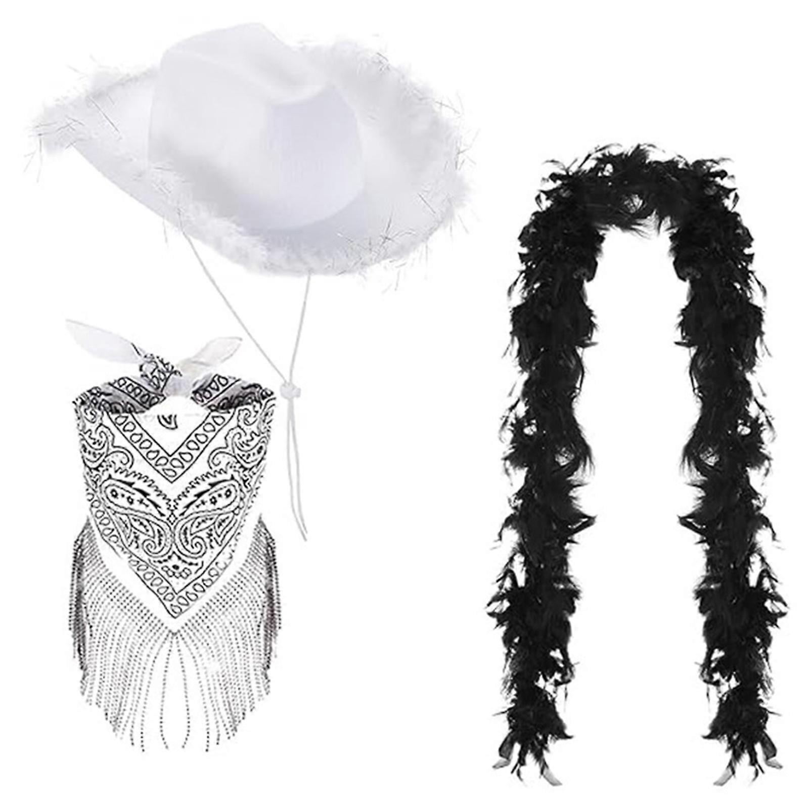 3PCS Rolled up Brims Cowboy Hats Cashew Print Kerchief Boas Set for Woman Spring Plush Trim Cowgirl Hat Photography